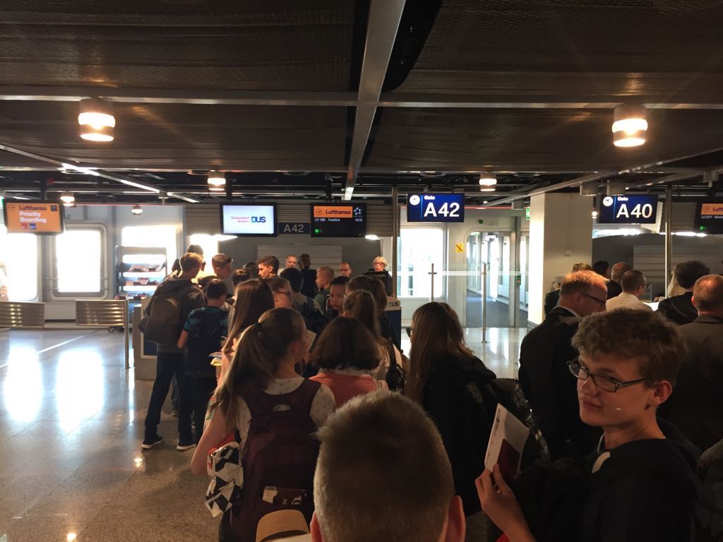 Viele Monate warten und jetzt geht es endlich los. Wir haben uns alle gegen 15:30 am Düsseldorfer Flughafen getroffen. Voller Vorfreude haben wir unser Gepäck aufgegeben und haben uns von unseren Eltern verabschiedet. Wir haben noch Abschiedsfotos gemacht, und dann ging es auch schon weiter zur Sicherheitskontrolle. Während alle unsere Handgepäckstücke kontrolliert wurden, gingen wir alle durch die Metalldetektoren. Als wir fertig waren, machten wir uns schon auf den Weg zum Gate. Dort machten wir es uns gemütlich, haben in den Läden gebummelt oder haben uns Verpflegung für den Flug gekauft. Nach und nach kamen alle zum Gate und wir haben Stadt, Land, Fluss gespielt, Musik gehört oder uns noch ein letztes Mal von den Eltern verabschiedet. Um 18 Uhr durften wir endlich ins Flugzeug und eine halbe Stunde später begab sich das Flugzeug auf die Startbahn. Nach einer Viertelstunde waren wir auch schon auf der höchsten Flughöhe angelangt und haben uns wieder auf den Landeanflug vorbereitet.