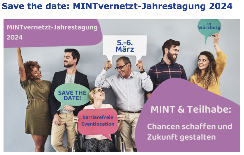 MINT & Teilhabe: Chancen schaffen und Zukunft gestalten. Unter diesem Motto findet vom 5.-6. März 2024 die zweite MINTvernetzt-Jahrestagung in Würzburg statt. Gemeinsam mit Euch erarbeiten wir konkrete Tipps und Handlungsempfehlungen, wie Ihr alle Kinder und Jugendlichen – ungeachtet ihrer sozialen Herkunft oder individuellen Fähigkeiten – aktiv in MINT-Angebote einbindet und sie so dazu befähigt, die Themenfelder der Zukunft mitzugestalten.