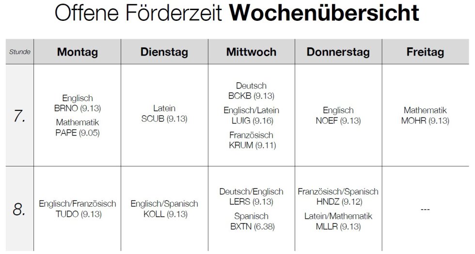 Hier finden Sie die aktuellen Förderzeiten und Räume der Fächer Mathe, Deutsch, Englisch, Französisch, Latein und Spanisch.