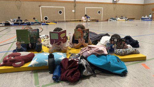 Leseabend für 5. Klässler in der TurnhalleLesen, lesen, lesen!Im November fand in der Turnhalle ein Leseabend für die 5. Klässler statt. Die Kinder machten es sich auf den Matten mit ihren Decken und Kissen gemütlich und lasen in ihren Lieblingsbüchern - dabei war die Buchreihe Woodwalkers besonders häufig vertreten. Im Anschluss stellten sich die Kinder ihre Bücher gegenseitig vor, bemalten Lesezeichen oder lösten knifflige Buchrätsel. Höhepunkt war für viele die gelieferte Pizza, die den Leseabend gemütlich ausklingen ließ. Der Abend war ein voller Erfolg und wird hoffentich in guter Erinnerung bleiben. Wir freuen uns auf den nächsten Leseabend im nächsten Jahr! |