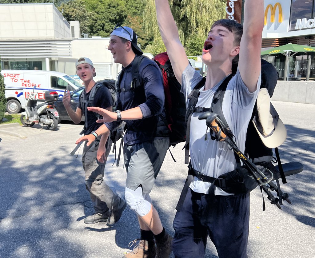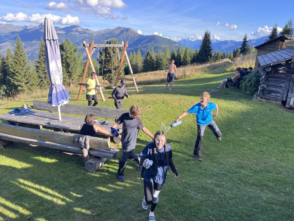 Als Erstes kamen die Sprinter Ilja, Anton Z., Jasper, Paul, Jonathan W. und Mark gegen 17 Uhr völlig erledigt an. Sie hatten auf ein Mittagessen verzichtet und sind nach dem Abstieg sofort mit Mark weiter gewandert. Der Rest trudelte etwa 20 Minuten später ein – und damit begann die alljährliche Wasserschlacht an der Winklerner Alm. Dabei bespritzten sich die alle mit Wasserflaschen, die sie im Wassertrog auf der Wiese aufgefüllt hatten. Das Ende der Schlacht wurde durch das überaus leckere Abendessen eingeläutet – mit zehn tropfenden Schülern als Ergebnis.
