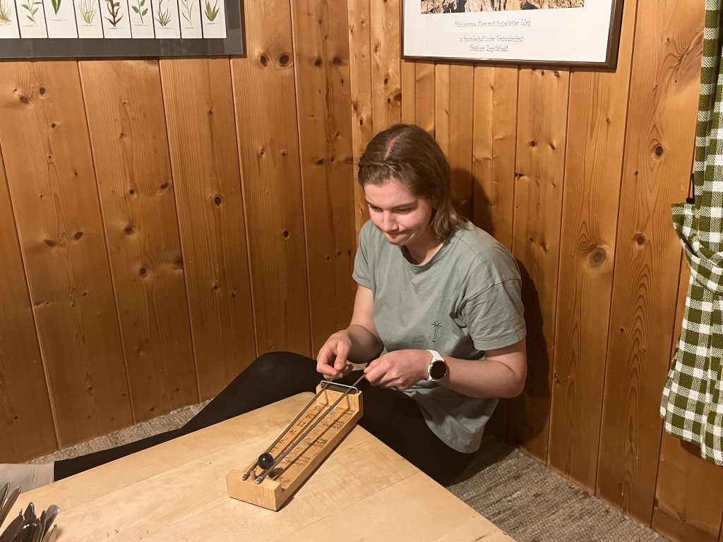 In einer Ecke tüftelt Frau Franke am beliebten Kugelspiel – Ziel ist es, mit zwei Metallstäben eine Kugel auf den Großglockner zu manövrieren. DIY-Skills waren gefragt: Das Spiel musste erst repariert werden. Markos Trick – Salz ins Schraubenloch, damit die Schraube wieder greift – funktionierte wunderbar. Jetzt liegt’s nur noch am Talent. Frau Franke verzweifelt daran seit 89 Minuten. Ich verzichte – mir fehlt da die Geduld.