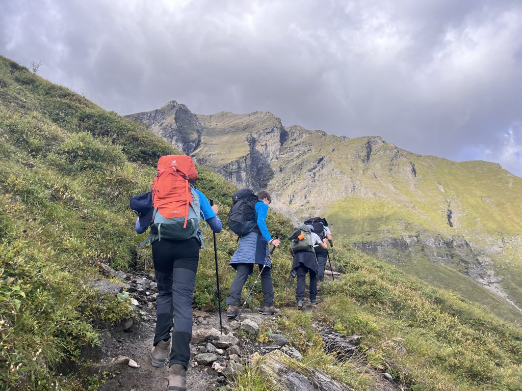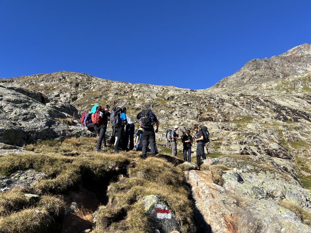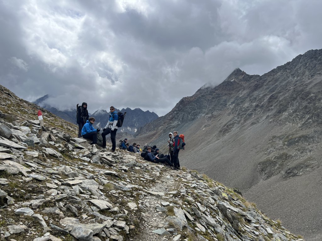 Um 8:20 Uhr ging es los Richtung Elberfelder Hütte, unserer Sektionshütte. Vor uns lag ein anfangs entspannter und dann recht steiler Weg. Der entspannte Weg, der Eselsteig, ging über eine lange Gerade mit guter Aussicht, weichen gelb-grünen Wiesen und Sonne, begleitet von Gesang und guter Stimmung. Nach ca. 90 min machten wir die erste große Pause, bei der wir schon den Gipfel des Bösen Weibeles (Höhe: 3100m) sichteten. Im Vergleich zu dem vorherigen entspannten Weg war die Pause kalt und eher unangenehm, da ein kalter Wind wehte. Der Boden war von dem regnerischen Wetter in der vorherigen Nacht noch nass und man konnte sich nicht entspannt hinsetzten. Nachdem Powerriegel und Brote trotzdem genossen wurden, ging es los in den schwierigsten Teil der Tour. Dieser Teil wurde von großen, nassen und rutschigen Steinen geprägt. Um diesen zu schaffen mussten wir unsere Schritte aufmerksam und gut wählen, weil sonst Steine oder wir fallen könnten. Das will ja keiner.