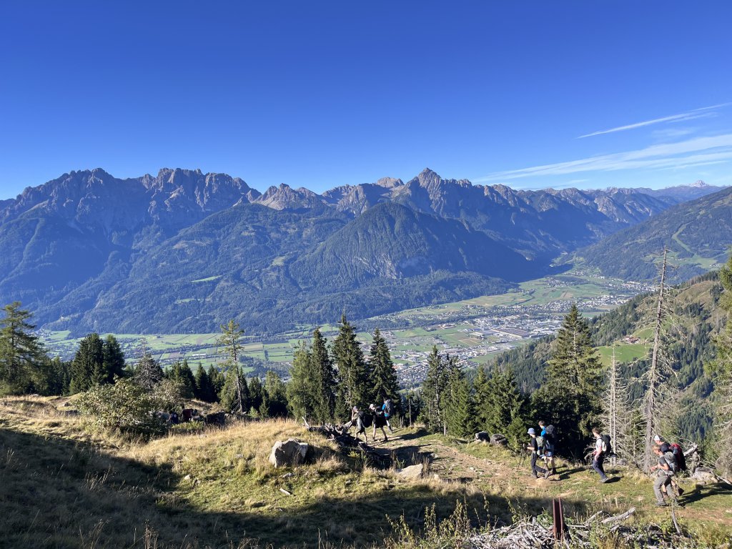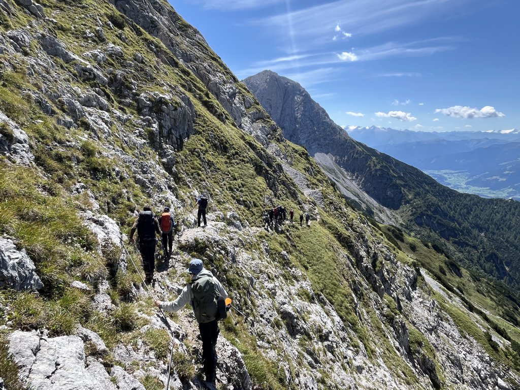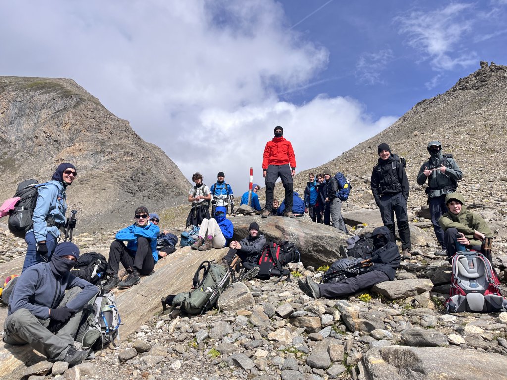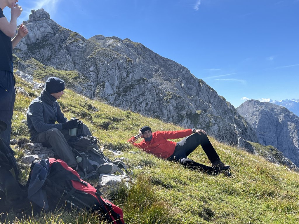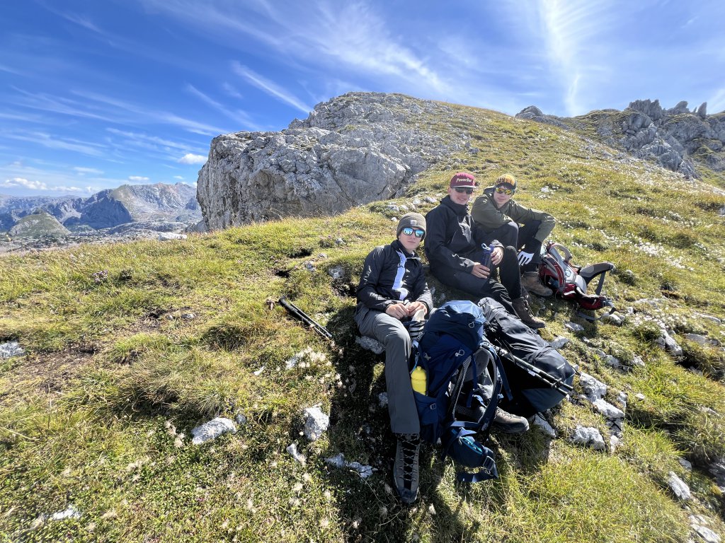 Während des Aufstiegs zur Scharte wurde, wie schon an den Vortagen, reichlich gesungen, um die Moral hoch zu halten. Jasper und Ilja sind da immer ganz in ihrem Element. Oben an der Scharte angekommen, nach ca. 450 Höhenmetern, legten wir eine Pause ein und genossen die wunderschöne Aussicht. Wir konnten bis zu den Dolomiten sehen.