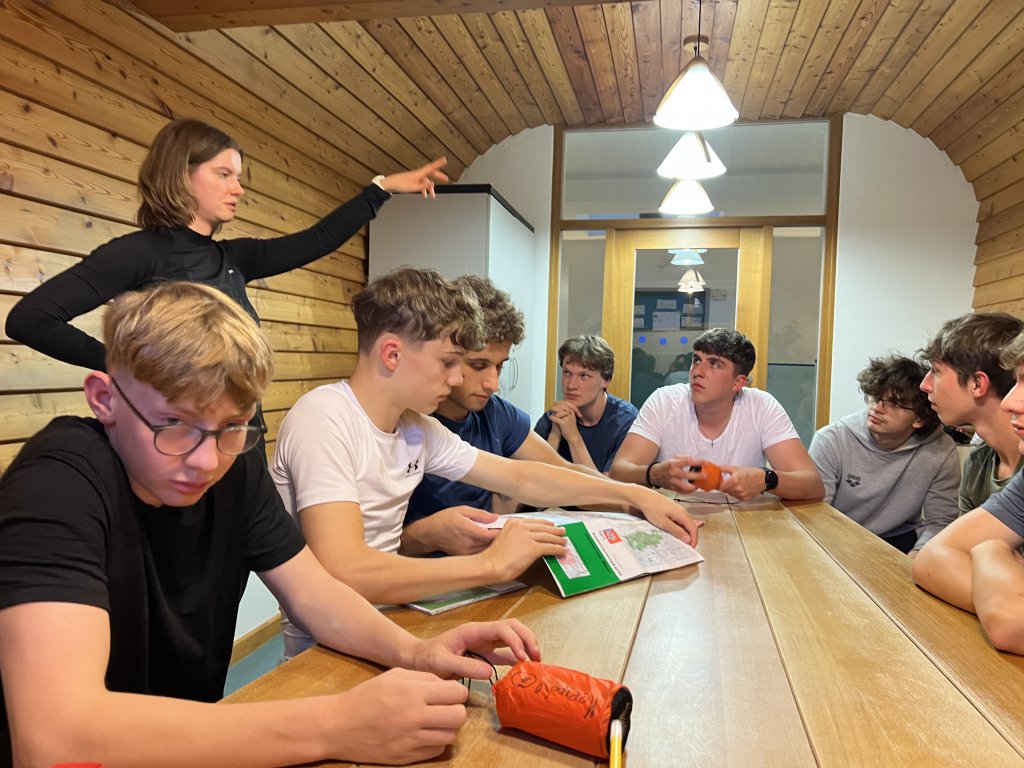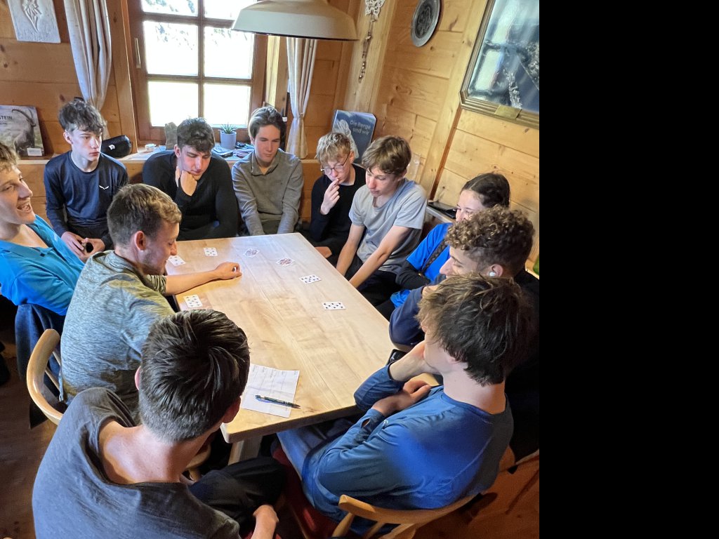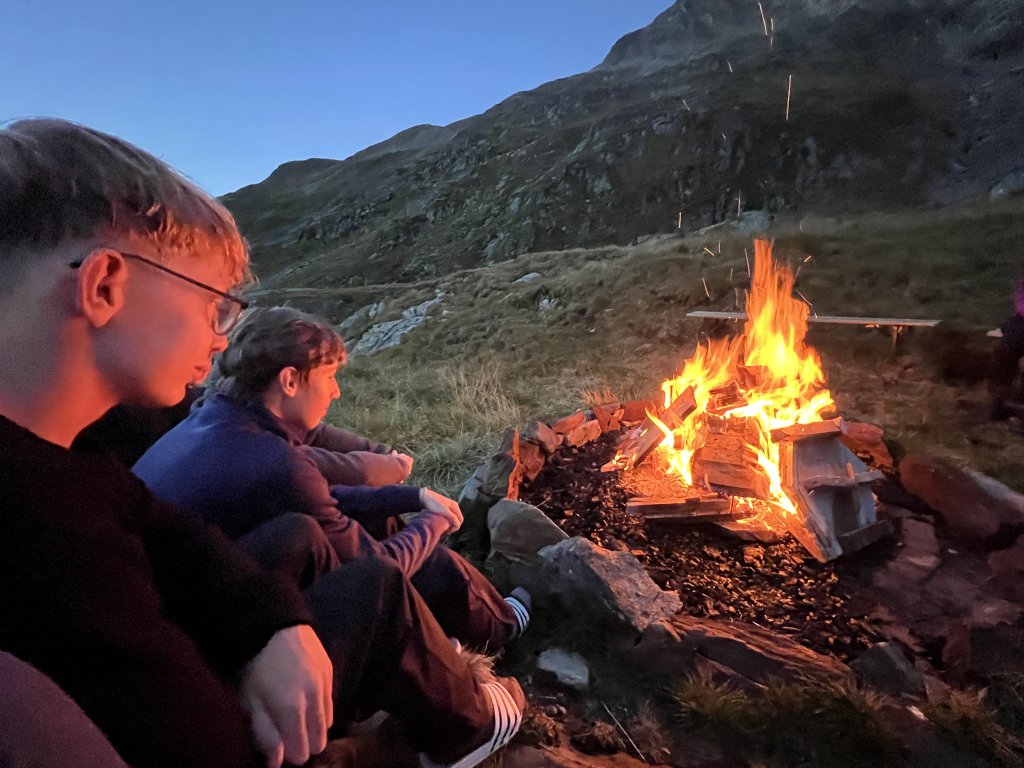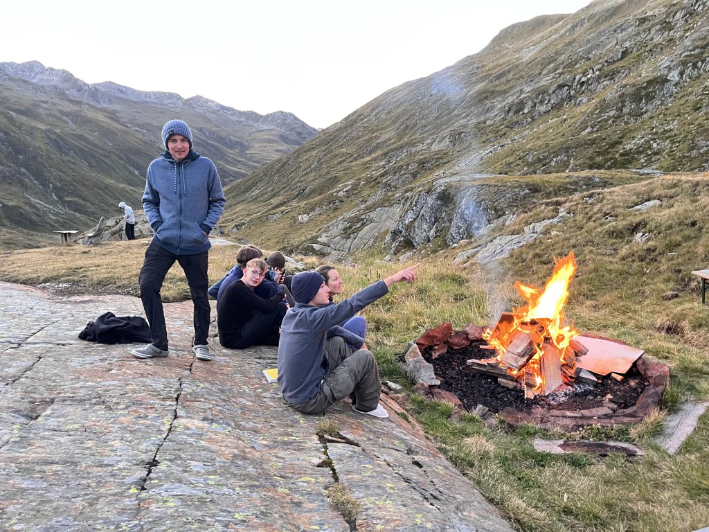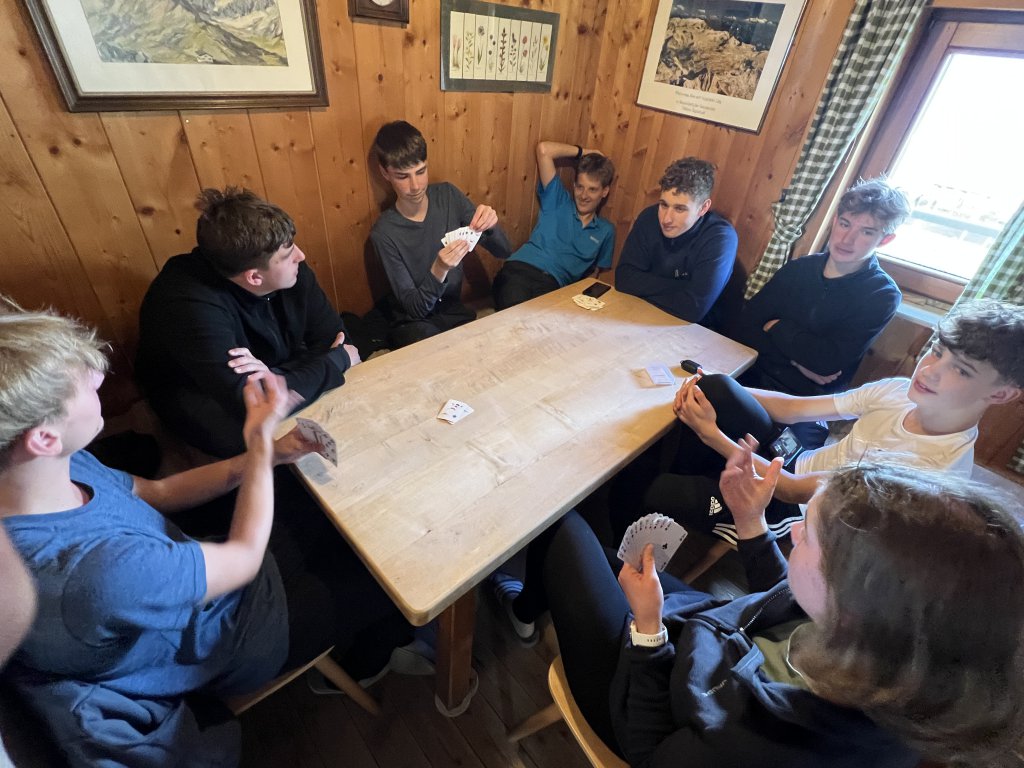 Rauf kommt man ja immer, aber der Abstieg war die eigentliche Herausforderung. Paul richtete nochmal seine Kniebandagen und der Rest schnürte die Bergschuhe fest und die eigentliche Herausforderung konnte angegangen werden. Marc ging voraus und ich diesmal hinten. Dort wurde ich von Paul, Jasper und Ilja gut unterhalten. Ob es für die Schüler* innen oder für mich das größere Wagnis war, kann ich nicht beurteilen, aber wir haben es aufgesucht, ausgehalten und aufgelöst. Beim Blick zurück konnten es Ilja und Paul kaum glauben, wo sie da heute runter sind. Den gesamten Abstieg hatten wir schon das Ziel im Blick. Angekommen bestellten die Schüler*innen erstmal alles, was die Speisekarte hergab. Abends wurde Jenga, Uno und Kniffel gespielt oder der Sonnenuntergang mit Zeitraffer gefilmt.