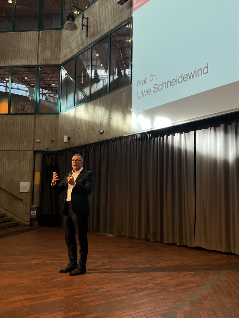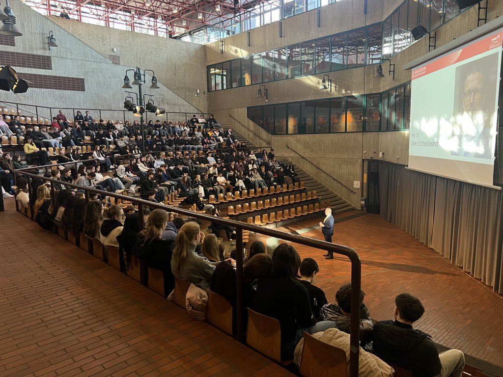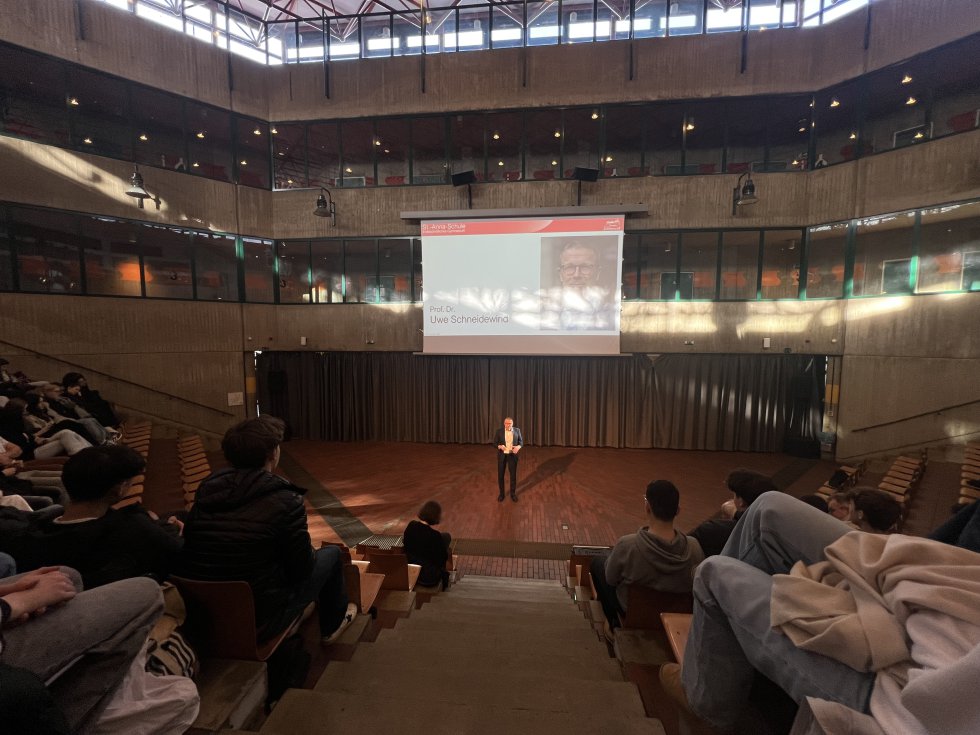 In seiner Eröffnungsrede betonte Prof. Dr. Schneidewind die Bedeutung der städtischen Transformation im Kontext von Klimawandel, Digitalisierung und sozialen Veränderungen. Der Vortrag umfasste verschiedene Aspekte der städtischen Entwicklung, darunter die Umgestaltung der Innenstädte, Mobilität und aktuelle Entwicklungen bezüglich neuartiger, digital organisierter Städte, den sogenannten Smart Cities. Prof. Dr. Schneidewind stellte den Schülerinnen und Schülern innovative Projekte wie Superblocks in Barcelona vor und sprach davon, dass es im Rahmen von Stadtplanung unabdingbar sei, auch mal mutig zu sein. Darüber hinaus thematisierte der ehemalige Leiter des Wuppertal Instituts die soziale Segregation innerhalb Wuppertals sowie die Notwendigkeit, bezahlbaren Wohnraum für alle schaffen zu müssen. Hierbei schneide Wuppertal im Vergleich zu Städten wie Köln oder Düsseldorf noch gut ab.