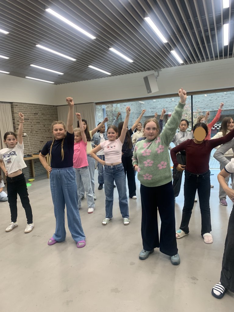 Die Proben waren neben der Gelegenheit, die eigenen künstlerischen Fähigkeiten zu verbessern, auch eine wunderbare Möglichkeit, über die Klassen- und Jahrgangsgrenzen hinweg neue Kontakte zu schließen. So begann jede Probenphase mit einer ausgiebigen WarmUp-Einheit. Dabei wurden imaginäre Geschenke in Bewegung verteilt, die bekannte „Stille Post“ getanzt und die Unterschiede zwischen Nuss-, Apfel- und Nadelbäumen mit Körper und Stimme hörbar gemacht. Beim Kanon „Let’s sing together“ wurden Groove, Gruppendynamik und Körperbewusstsein geschult.