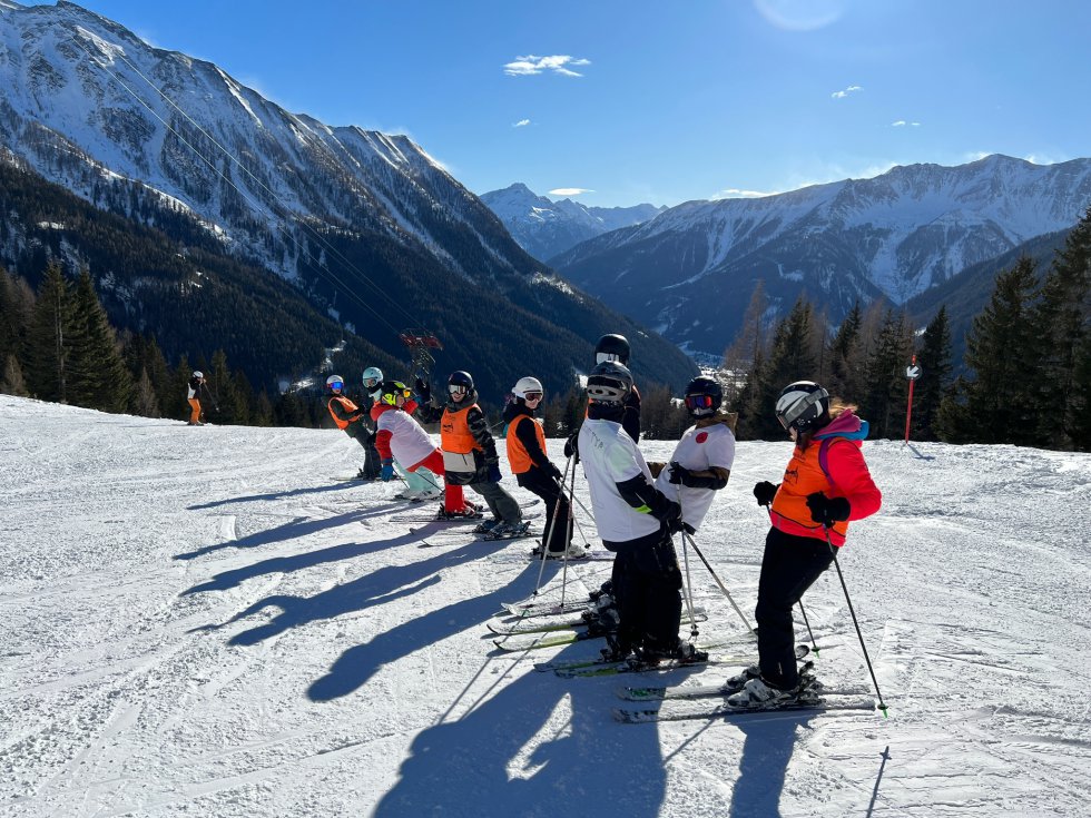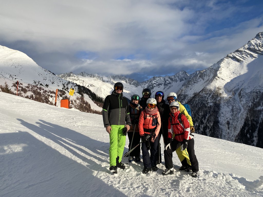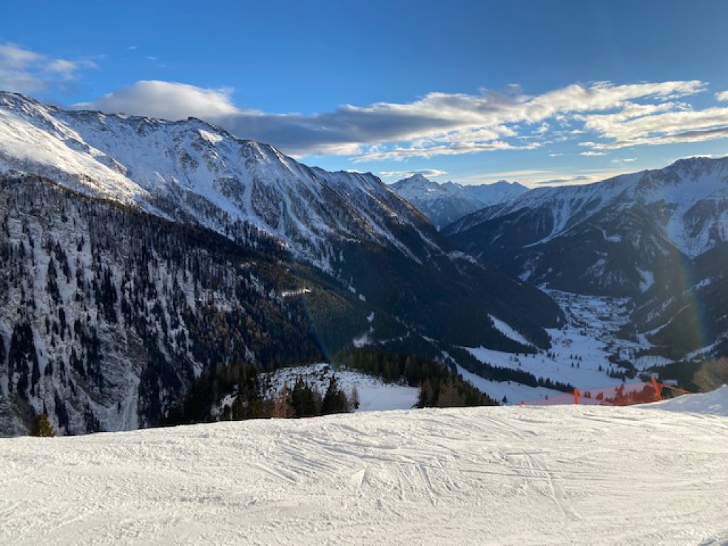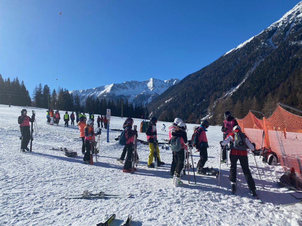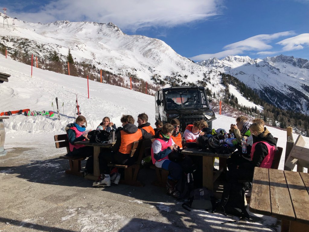 Da Noel und sein Doppeldecker unter einer Eisenbahnbrücke stecken bleiben würde, müssen wir auf den örtlichen Skibus ausweichen. Am Köfelelift angekommen, werden die Schüler*innen auf die einzelnen Lehrer*innen aufgeteilt, die Skifahren unterrichten dürfen. Dementsprechend sind Frau Bruno und ich raus. Ich wage mich gleich an den Lift und fahre nach oben. Unterwegs halte ich immer bei den einzelnen Gruppen, die sich je nach Können einfahren und ihre Kompetenzen unter Anleitung erweitern. Es scheint Spaß zu machen, bei dem Wetter und den tollen Schneeverhältnissen auch kein Wunder. Und zu voll ist es auch nicht.