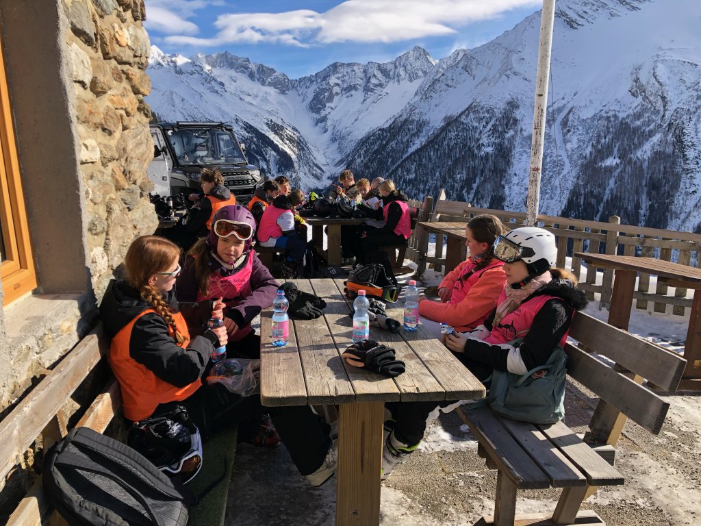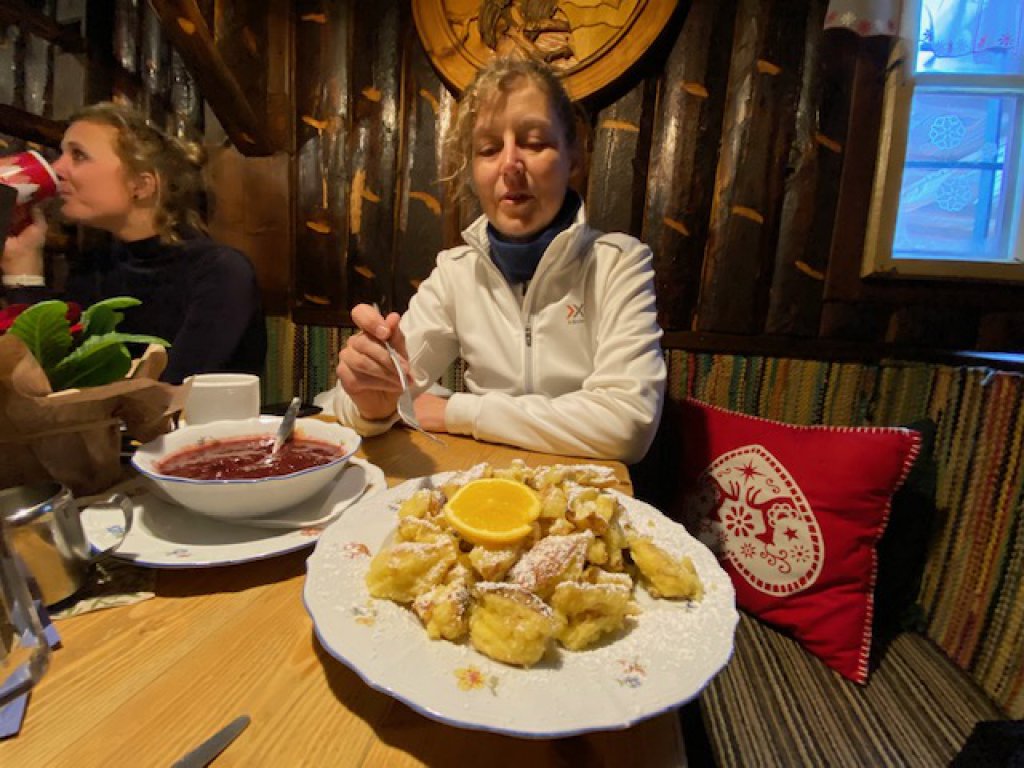 Da ich erst später aufgebrochen bin, gönne ich mir die Fahrt rauf zur Mittelstation, wo ich die anderen Kolleg*innen treffe. Heißer Kakao, Topfenstrudel, Kaaspressknödelsuppe, Schorle und Skiwasser beenden einen weiteren gelungenen Tag, der morgens noch gar nicht so aussah. Oben hat es ziemlich geblasen, sodass der Mölltaler Gletscher gesperrt war. Das hatten wir eigentlich vor, um auch die Anfänger einen Hauch von Hochgebirge erleben zu lassen. Aber morgen ist auch noch ein Tag! Und morgen Abend wissen wir, wie der war.