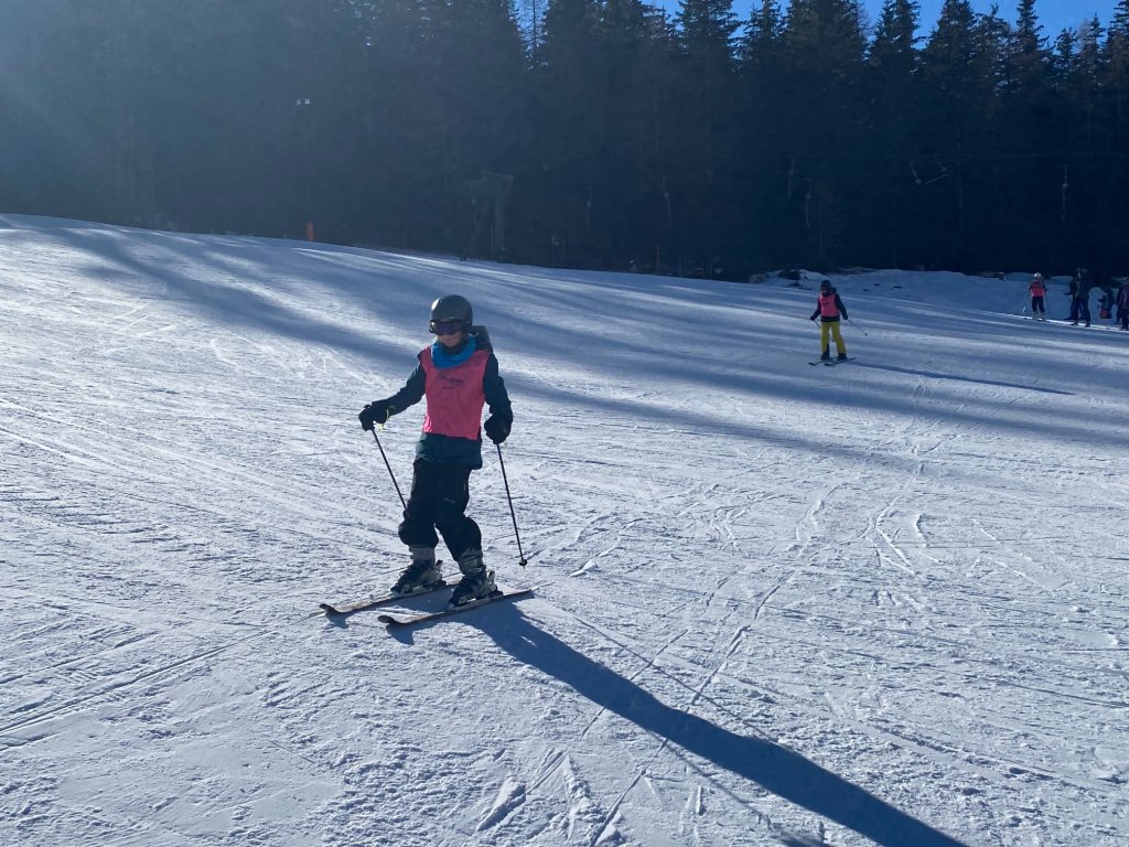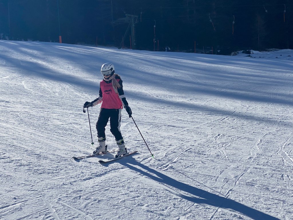 Auf der Piste am Anfängerhügel sieht man kaum noch Anfänger von uns, die am kurzen Tellerlift üben. Mir kommen jede Menge Schüler*innen von gestern entgegen, die noch am Vortag langsam und bedächtig den Berg heruntergekrochen kamen. Nun aber mit ordentlich Speed unter den Brettern, auch wenn ich als Laie nicht erkennen kann, ob das Absicht oder mangelhafte Bremskompetenz gepaart mit Waghalsigkeit ist. Aber die zufriedenen Gesichter meiner Kolleg*innen lassen auf eine hohe Lernprogression schließen. Wunderbar! Überhaupt haben unsere Skilehrer*innen das alles wirklich im Griff. Hier wird gelehrt, mit Spaß an der Sache, jeder Menge Geduld und Nachsicht. So soll das sein!