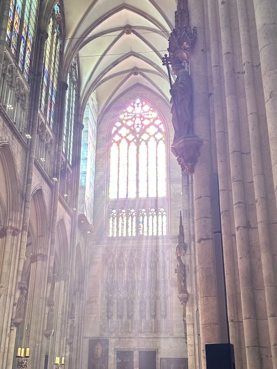 Im Anschluss begaben sich die Lernenden über die Hohenzollernbrücke zum Kölner Dom, der mit seiner beeindruckenden Architektur und den kunstvollen Fassadendetails wie beispielsweise den biblischen Figuren am Petersportal besonders hervorsticht. Beim Betreten des Doms begrüßten Schülerinnen und Schüler einer beteiligten Schule die Ankommenden mit live gesungener Musik, durch die eine feierliche Atmosphäre entstand. Der Dom war prall gefüllt, so dass einige auch auf dem Fußboden Platz nehmen mussten. Der Gesang begleitete den ganzen Gottesdienst und gehörte zweifellos zu einem der Höhepunkte des Tages.