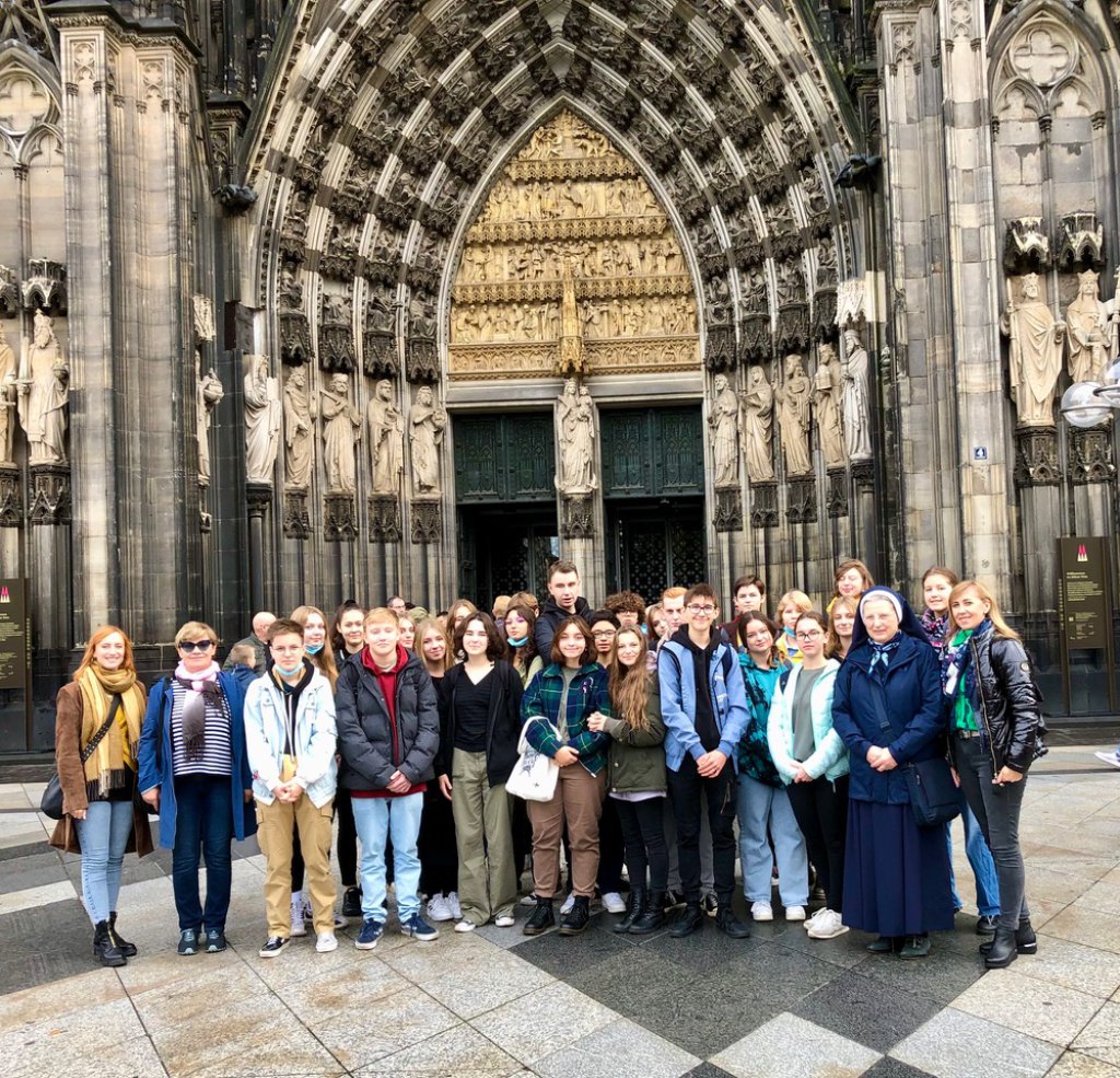 Der Dienstag stand im Zeichen der „Hauptstadt“ unseres Erzbistums: Köln (Wetter o.k.). Erstes Highlight natürlich der Kölner Dom, wobei Wissenswertes zu Fenstern, Gräbern, Bildern und Heiligenfiguren zu erfahren war. Nach zwei weiteren Kirchen besichtigten wir das Denkmal für die jüdisch-christliche Philosophin Edith Stein, einer der Lieblingsorte unserer kompetenten Begleitung Sr. Celina. Anschließend konnte – weitere Besonderheit - das Schokoladenmuseum bestaunt werden, ein paar Kostproben inklusive. Die verbleibende Zeit nutzen die SchülerInnen in Kleingruppen für einen Stadtbummel.