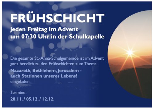 Frühschicht im AdventZeit für BesinnlichkeitBald beginnt wieder die Adventszeit. Diese wollen wir gern mit euch auch außerhalb des Unterrichts genießen. Lehrende und Lernende sind hierzu zu den angegebenen Terminen herzlichst eingeladen! |