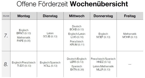 Aktueller FörderplanHier finden Sie die aktuellen Förderzeiten und Räume der Fächer Mathe, Deutsch, Englisch, Französisch, Latein und Spanisch. Die Anmeldung erfolgt i.d.R. über den Fachlehrer, eine freiwillige Teilnahme ist aber ebenfalls jederzeit möglich. Beispielsweise vor Klassenarbeiten hat man die Möglichkeiten, häufiger pro Woche am Förderunterricht teilzunehmen.