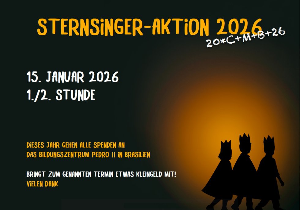 Am Donnerstag, dem 15.01., besuchen uns in der 1./2. Stunde wieder die Sternsinger aus St. Laurentius. Anstatt von Haustür zu Haustür gehen sie bei uns natürlich von Klassentür zu Klassentür, um ihren Segen zu spenden und die bekannten Aufkleber mit ihren Initialen C, M und B an die Klassentüren zu heften. Natürlich würde Sie sich freuen, wenn sie auch die eine oder andere Spenden mitnehmen könnten; diese gehen wieder an das Bildungszentrum Pedro II in Brasilien, das von St. Laurentius unterstützt wird. Daher wäre es klasse, wenn der eine oder andere an diesem Tag ein bisschen (Klein)Geld mitbringen würde.