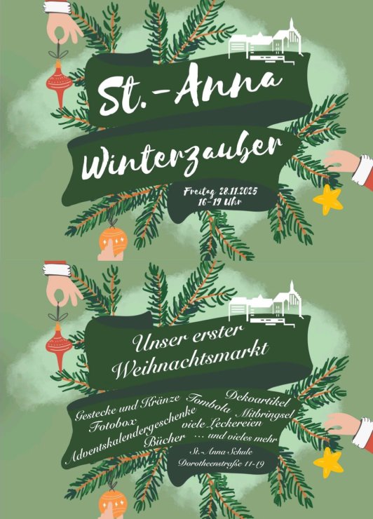 Wie sich ja bereits herum gesprochen hat, wird es in diesem Jahr, am Freitag, dem 28.11.2025, und zwar von von 16 Uhr bis 19 Uhr, unseren ersten "Winterzauber"-Weihnachtsmarkt an St. Anna geben! Die "Altvorderen" unter den St.-Anna-Kennern werden sich gewiss noch an die Basare erinnern, die alle zwei Jahre die Schulgemeinde mit großerr Begeisterung versetzte und das gesamte Schulgebäude und -gelände, vom Keller bis zum Dach, mit prallem, vorweihnachtlichen Leben erfüllte.