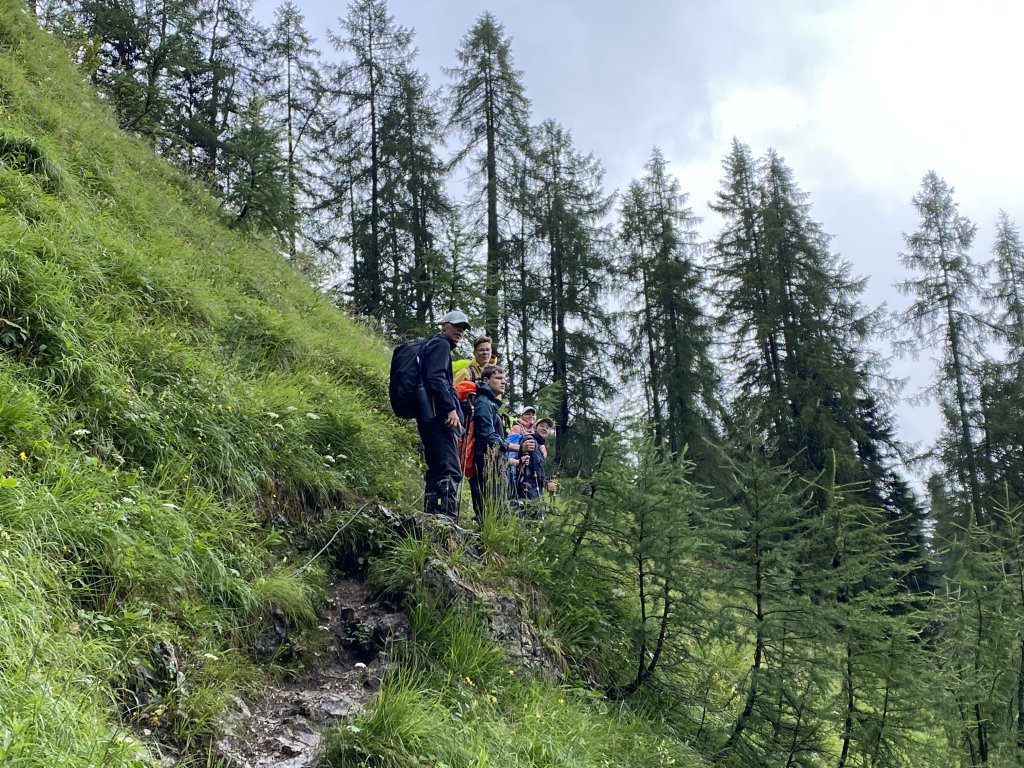 Rucksack herum. Alex versichert mir, dass das Pferd mich mag. Ich suche trotzdem das Weite… es geht immer weiter abwärts, irgendwann ist die Baumgrenze erreicht und die Landschaft ändert sich. Aus Pfaden werden befestigte Wege und irgendwann sind alle auf der schönen kleinen Winklerner Alm. Lecker Essen und wunderbare Gastfreundschaft prägen diese Hütte. Abends gibts neben den obligatorischen Werwölfen Schnitzel und Kartoffelsalat. Ein feiner Abschluss, denn morgen gehts hinunter nach Lienz und Freitagabend sind alle wieder in Sicherheit.