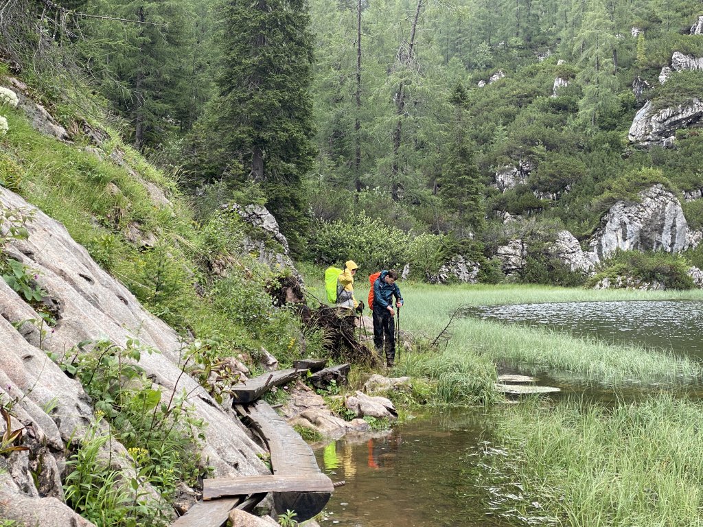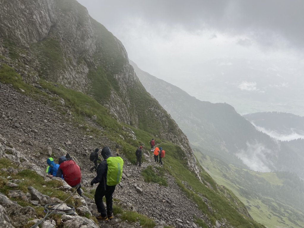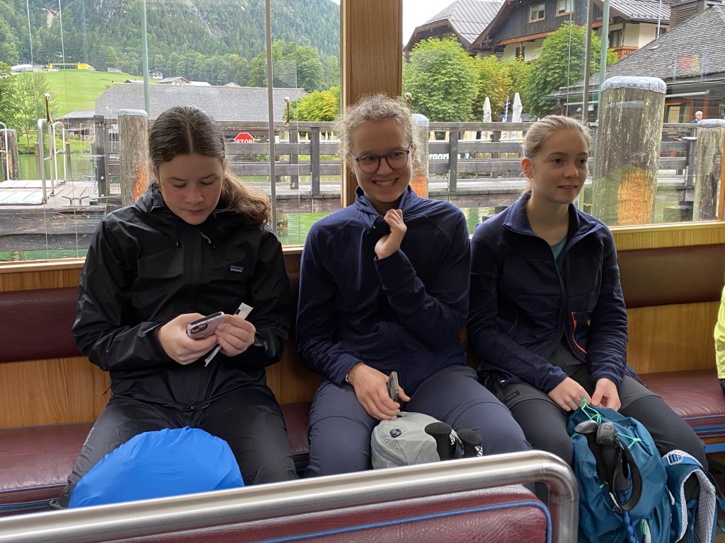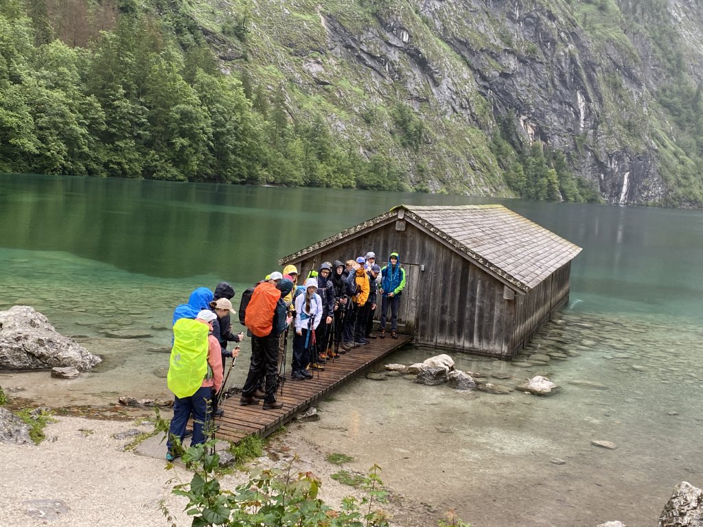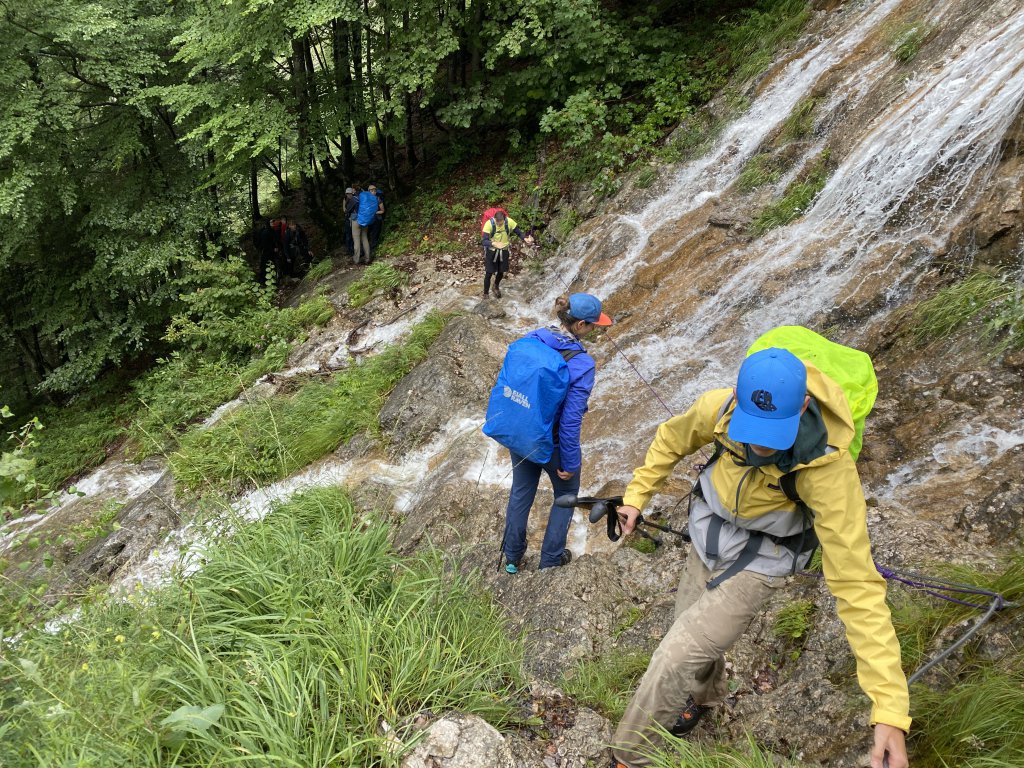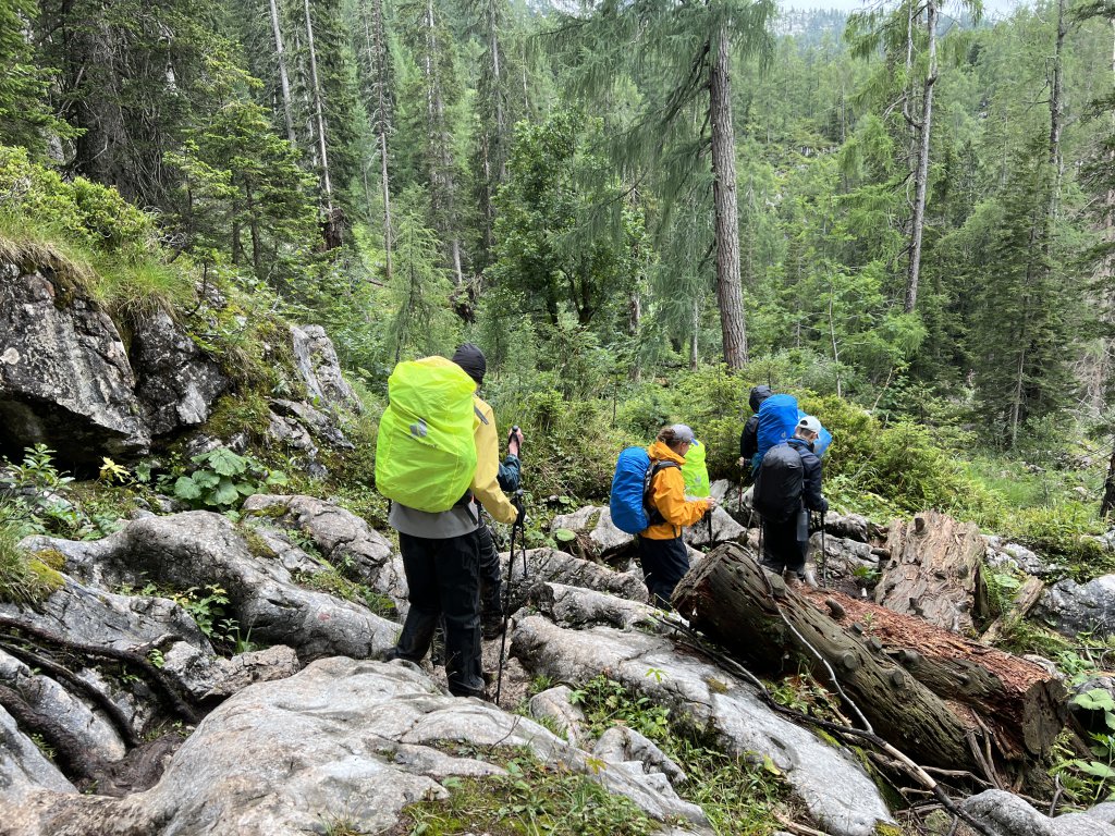 Heute haben wir nicht nur teures Regenzeugs dabei, wir ziehen direkt in Plastik los. Es plästert zwar nicht mehr so heftig wie gestern, aber der feine Regen zieht doch souverän in die Klamotten. Hilft nix! Um 9 gehts los Richtung Kärlingerhaus. Große Hütte, aber schön warm und etwas mehr Platz! Der Weg dorthin ist einfacher als gestern (der Clou bei Hüttentouren: man hat einen harten Aufstieg, ist dann aber für die kommenden auf Höhe), aber der Dauerregen der letzten Tage hat die Wege aufgeweicht, sodass man beim Gehen höllisch aufpassen muss, wohin man tritt. Kurze Pause am Halsköpfl. Gute Aussicht, aber es bläst ein ordentlicher Wind. Ich bleibe unten , habe Empfang und erledige „Büroarbeit“. Diese Tour will ja auch unterwegs organisiert werden. Danach gehts runter zum Schwarzensee, den man über wenig stabile Planken passiert. Dann gehts wieder rauf, wieder runter zum Grünsee. Hat man dann die „Himmelsleiter“ hinter sich, stößt man auf den direkten Weg von St. Bartholomä am Königssee zum Kärlingerhaus. Das taucht wie immer urplötzlich auf. Die meisten haben Kuchen und Kaffee bereits auf und haben sich in Form gebracht. Das neue Hüttenteam hat es auf jeden Fall drauf. Das Essen ist hervorragend, der Empfang herzlich. Mara, Ida und Mark testen im Funtensee wie sich 11 Grad Wassertemperatur anfühlen. Ein paar Jungs machen ihnen das nach dem Abendessen nach. Kurz: ein durchschnittlicher Montag. Alle haben gute Laune. Spätestens auf der reizenden Peter-Wichenthaler-Hütte wird das Hüttenleben in Fleisch und Blut übergangen sein. Und morgen soll endlich die Sonne scheinen.