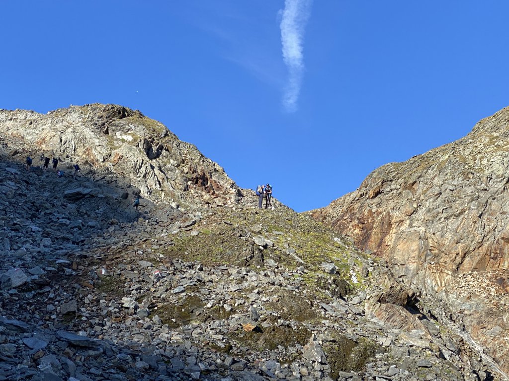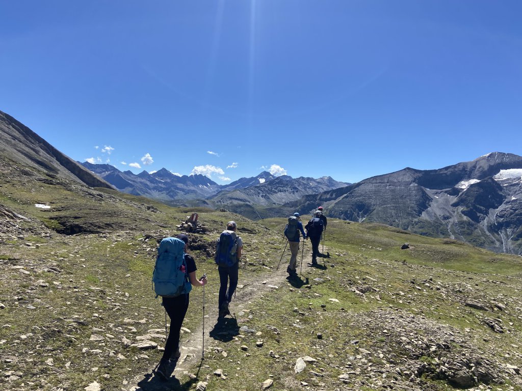 Wir brechen gegen 09:00 Uhr auf. Es geht zunächst runter zur Staumauer des Mageritzenstausees und dann steil ansteigend in den Hang zur Scharte auf 2505 m hoch. Die Aussicht auf den Glockner, die Pasterze und die umliegenden 3000er ist atemberaubend. Man merkt, dass unsere Wanderer mittlerweile gut eingelaufen sind. Es geht zügig aufwärts und nach knapp zwei Stunden ist die Scharte erreicht. Wieder sieht man, wie weit der Gletscher seit unserer letzten Tour weiter weggeschmolzen ist. In der Tat, was das Klima angeht, steuern wir auf einen Totalschaden zu, sollte sich das Menschengeschlecht nicht bald eines Besseren besinnen und handeln.