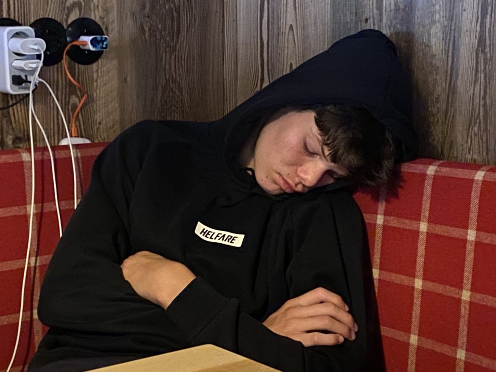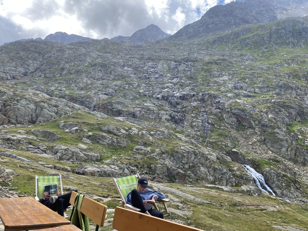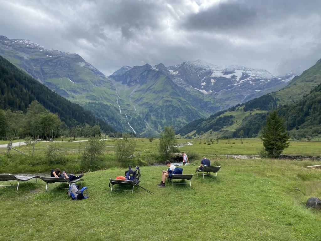 Ausschlafen (die anderen, ich sitze bereits um 7 einsam beim Kaffee), frühstücken, Zeit totschlagen. Nach dem Frühstück entdecke ich den Liegestuhl auf der Terrasse und lese Stephen Kings „Fairy Tale“, Emma und Kathi vertiefen sich in Liebeshorrorthriller, Mark lernt bei John Grisham, was ihn als Anwalt erwarten könnte. Ggf. schreckt das ab und er wird doch noch Lehrer. Jedenfalls brauchen wir dafür weder LTE noch W-Lan. Danach suchen einige verzweifelt. Aber hier existiert das nicht. Wie fein. Zudem werde ich von einem zufällig anwesenden Fernsehteam über meine Eindrücke über die Schobergruppe interviewt. Ich komme ins Fernsehen (Servus TV im Oktober!), werde sicher entdeckt und starte eine zweite Karriere. Guter Plan! Aber bis dahin: weiter faulenzen erstmal…
