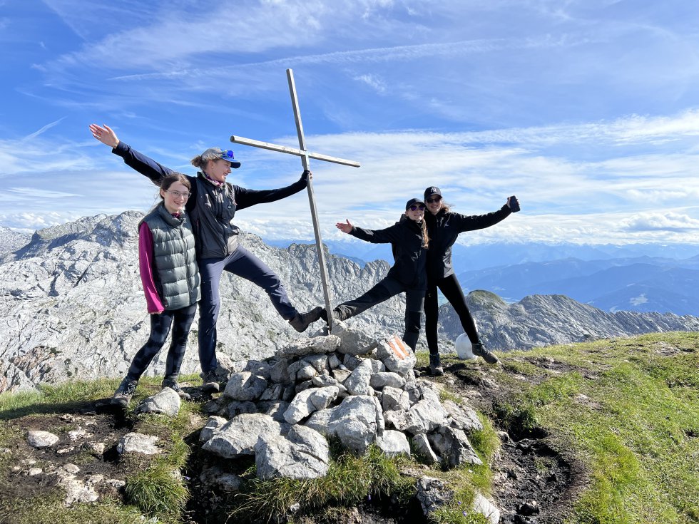 Wir wandern nach einer Pause weiter über den Wiener Höhenweg am Steilhang entlang, inkl. Tiefblick ins Leitertal. An der Salmhütte wird gegessen und getrunken. Kathi und ich freuen uns, die Hüttenwirte Helga und Martin wiederzusehen. Wie schon gesagt: Rituale wollen gepflegt werden. Der Rest des Weges ist schnell abgelaufen. Ein paar Unempfindliche hopsen noch fix in den Bergsee am