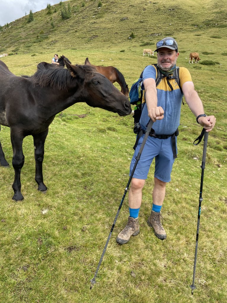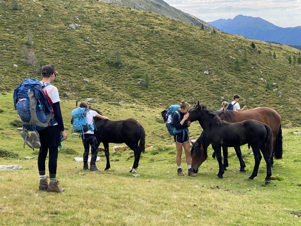 Aufbruch um 08:30 Uhr. Ein kurzer, steiler Anstieg führt uns auf die Obere Seescharte. Der Blick tief hinunter ins Debanttal und weit in die Südtiroler Dolomiten ist atemberaubend. Viel interessanter ist jedoch der LTE Empfang. Endlich wieder sinnlose Whatsapps lesen, Instagram Profile füllen, Mama, Papa, Opa, Tante informieren, dass man gerade Internet hat… aber das ist schon OK. Ich gehe schließlich mit schlechtem Beispiel voran und beantworte ein paar der zig Dienstmails, die aufgelaufen sind. Wer weiß schon, wo das nächste Funkloch lauert. Irgendwann blase ich zum Aufbruch und gehe voran, den Wiener Höhenweg hinunter. Unten beginnen dann die Almwiesen. Dort lassen wir die Kinder laufen. Natürlich mit dem Hinweis, Selfies mit süßen Kälbern zu unterlassen. Mama Kuh ist bekanntlich nie weit. An einer Horde Pferde kommen die Kinder dann doch nicht vorbei, ohne innige Freundschaften zu schließen. Ich wusste gar nicht, dass die Tiere so zutraulich sind. Eins verfolgt mich und leckt an meinem