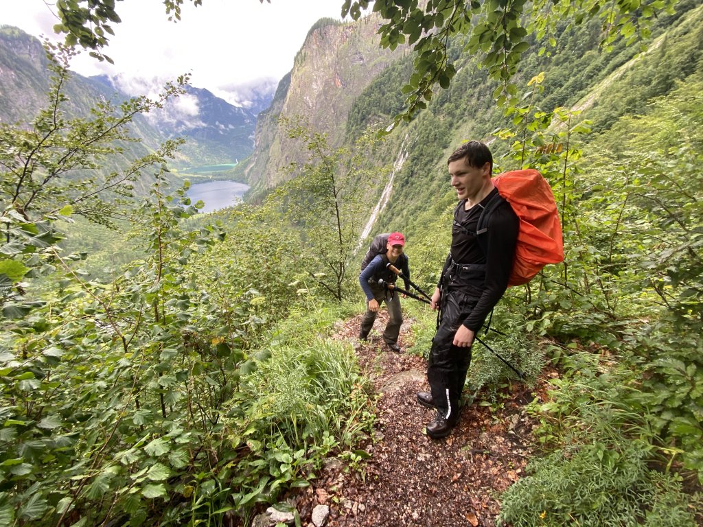 Der Blick aus dem Fenster? Regen. Regen. Und nochmal Regen. Das wird ein interessanter Tag, denn nach der Bootsfahrt über den Königssee und der schönen Wanderung um den Obersee bis zum Röthbachfall gehts über den Röthsteig rauf zur Wasseralm. Bei guten Wetter ist der Röthsteig auch anstrengend, aber gut zu gehen und die Aussicht ist ziemlich spektakulär. Bei Regen jedoch wird der Röthsteig zum Röthsteigwasserfall. Überall plätschert über die Bäche Wasser in die Gore Tex Schuhe. Dann ist alles rutschig, Wasser von oben, von unten, von der Seite, von den Büschen. Aber: tapfere Truppe! Kein Gemecker, man fügt sich und macht das beste draus. Hoch über dem Obersee klart es denn auch ab und auf, man hat einen tollen Blick hinunter ins Tal. Irgendwann ist man oben. Es geht ein bisschen raus, ein bisschen runter, durch dichten Wald und über ob des Wetters reißende Flüsse. Und irgendwann öffnet sich der Dschungel und steht vor der Wasseralm. Ich bin wie üblich der letzte. Die anderen sitzen bereits bei Kaffee und Kuchen, die Klamotten trocknen über dem Gasofen. Wie fein!