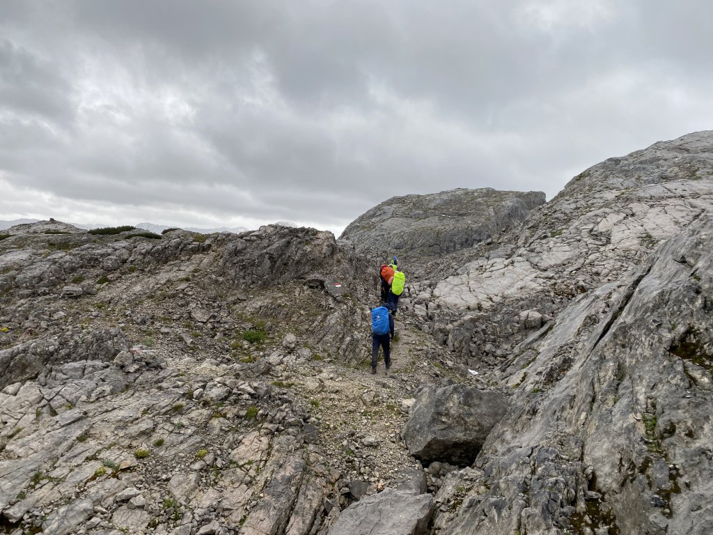 Zu früh gefreut. Dachten wir gestern noch, dass wir die Regensachen tief in den Rucksack und die Sonnenbrille endgültig aus dem Rucksack packen können… nix da. Der Morgen begrüßt uns nicht nur mit feinem Frühstück, sondern mit Grau in Grau und Regen. Und das so richtig ergiebig. Hilft nix, da muss man jetzt durch. Wir starten in buntem Gore Tex ins Steinerne Meer. Gestern noch nahezu idyllisch, heute irgendwas anderes. Wenigstens ist der Weg zur heutigen Unterkunft vergleichsweise einfach. Steil geht zur Weißbachlscharte rauf, runter ist es teils etwas heikel. Aber alle sind in der Zeit auf der Hütte für heute Abend. Die liegt beeindruckend isoliert auf einem kleinen Gipfel. Es gibt lecker Kuchen, Pommes und Grillwürschtl für gerade mal 9,- (sofern man im Alpenverein ist), kühle Getränke, heiße Duschen… zum Abendessen sind alle wieder in Form. Die Chefin und ich gönnen uns einen Rotwein, die Kinder vergnügen sich mit Spielen, die ich nicht verstehe. Aber Spaß haben sie. Wäre das Wetter besser: eigentlich ein perfekter Tag. Aber es wäre naiv zu glauben, dass es in 14 Tagen immer trocken bleibt. Bergsteiger sind bekanntlich von naivem Optimismus geprägt, von daher: nasser geht immer…