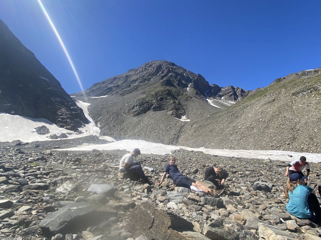 Um 8 Uhr sind alle bereit zum Abmarsch. Es geht weiter über den Wiener Höhenweg, den wir diesmal dem Eselsteig vorziehen. Eine Stunde weniger Wegstrecke ist bei dem heutigen Pensum durchaus angenehm. Zunächst gehts über das große Blockfeld, auf dem man sich sehr konzentrieren muss. Aber das haben wir fix und unbeschadet hinter uns. Zudem ist die Aussicht prächtig! Am Perlschlachtörl auf knapp 2300 m treffen wir die anderen wieder. Kathi geht mit Caro, Mara, Ida und Alex über das Böse Weibl. 3126 m ist das Weib hoch. Vermutlich wollen die Männer deswegen nicht rauf. Männer haben ja immer Angst vorm Scheitern, denn es könnte ja jemand lachen, sollte man mit seinen Kräften schneller am Ende sein, als ich. Eine fragwürdige Einrichtung der Natur. Offensichtlich… Dafür eine echte Mädelpowergipfelwandertruppe! Die Frauen haben in diesem Durchgang sowieso die nötige Power. Ich gehe mit Mark und Emma mit dem Rest weiter über die Kesselkeesscharte. Mit 2960 m ist das der höchste Übergang dieser Tour, lässt man die Gipfel links liegen. Der Weg rauf ist durchaus anspruchsvoll, uneben und teils ausgesetzt. Aber geht man langsam und aufmerksam, ist auch dieser Steig gut machbar. Alle kommen in der Zeit oben am Biwak an. Emmas „Team Leistung“ ist da schon kurz vor der Hütte. Danach gehts steil hinunter. Die Elberfelder Hütte ist ab hier immer im Blick. Unten im Gletscherkar lassen wir die Kinder laufen. Der Weg ist gut erkennbar, sodass das vertretbar ist. Mark und ich trotten langsam hinterher, führen hochphilosophische Gespräche, wie man sie nur auf unebenem Untergrund führen kann und sehen irgendwann, dass die Jungs Ada abgehängt haben. Ein Intensivkurs in „Wie übe ich mich im Gebirge in Achtsamkeit gegenüber Mitwandernden, die nicht ganz so schnell sind“ ist hier dringend von Nöten! Aber wir nehmen Ada ins Schlepptau und kommen dann zur besten Kaffeezeit an der Elberfelder Hütte an, wo wir von Herbert und Lucas und ihrem Team freudig begrüßt werden. Wie immer ist es „wie nach Hause kommen“. Die von einem fabelhaften Team geführte Hütte ist einfach ein „nice place to be“, weit hinten im Gößnitztal, umgeben von mehreren Dreitausendern. Die Lager sind fix bezogen. Abends gibts reichhaltiges Essen. Es wird gespielt, gelesen, getrunken, gequasselt und vor allem haben alle im Hinterkopf, dass morgen kein Programm auf dem Programm steht. Ausschlafen, nichts tun, vielleicht ein bisschen die Gegend erkunden. Kurz: Seele baumeln lassen. Nach acht Tagen wandern mit Sonnenschein, mit erheblichen Höhenmetern, aber eben auch ergiebigen Regengüssen, kaltem Wind, Schneefeldern, Matsche, Erkältungen bei dem einen, Wanderkoller bei der anderen und Abnutzungserscheinungen beim Senior in der Teamleitung haben wir uns das verdient!