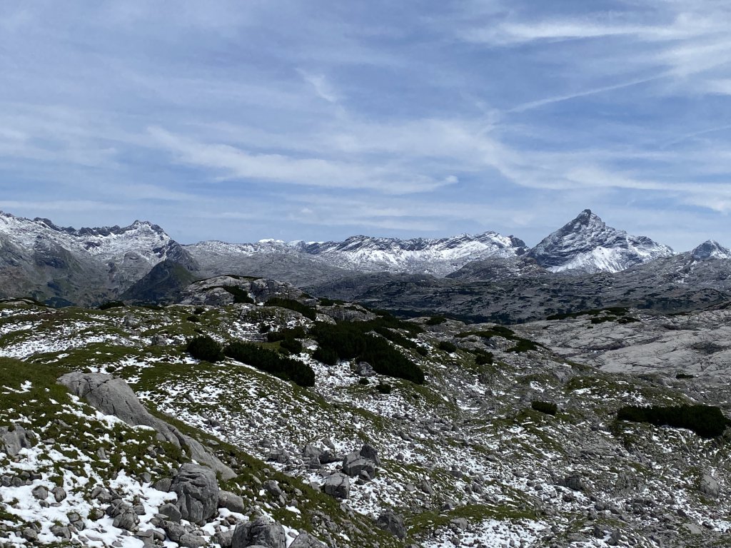 Ah! Nach zwei Tagen Dauerregen endlich Sonnenschein und blauer Himmel! Dazu hat der Allerhöchste die Berge rund um das Steinerne Meer mit Neuschnee versüßt. Das wird ein Wandertag wie aus dem Reiseprospekt. Los gehts nach ausgiebigem Frühstück. Der Weg ins Steinerne Meer ist zunächst steil, ist man aber einmal auf Höhe, gehts nur noch moderat bergauf auf gutem Weg. Und was für einen Aussicht! Die Schönfeldspitze, und das in der Tat an ein Meer erinnerndes Feldkar dominieren die Szene. In der Ferne kann man den Hochkönig erkennen. Die Schüler*innen sind ganz verzückt von der Tierwelt. Murmeltiere, jede Menge Schafe in unterschiedlicher Wollqualität und sogar Gemsen lassen sich blicken. Ich gehe etwas hinterher. Über mir kreisen Krähen. Wohlmöglich wirken ich alleine wie eine mögliche Futterquelle, sollte ich diese Wanderung nicht überleben. Aber auch ich komme irgendwann am Ingolstädter Haus an. Gemütlich, gastfreundliche Wirtsleut, nette Mitwanderer und gutes Essen. Die Hütte scheint doch besser zu gefallen, als die einfache Wasseralm zwei Nächte zuvor. Abends gehts wieder früh ins Bett, auch wenn die Tour morgen auch nicht wirklich anspruchsvoll ist. Übermorgen sind wir dann wieder kurz in Saalfelden in der Zivilisation (W-lan!!!!) und dann gehts in die Wildnis!