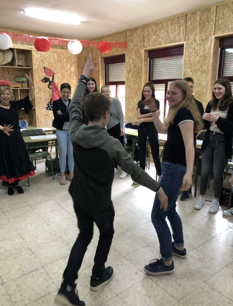 Heute haben sich alle SchülerInnen und die LehrerInnen um 8:30 Uhr zum Schulstart an der Schule getroffen. Dort wurden wir durch den Schulleiter in einer Rede herzlich begrüßt. Die spanischen SchülerInnen sind dann zu ihrem regulären Unterricht gegangen und wir haben eine Führung durch die Schule erhalten. Der Führung folgte eine Art Probeunterricht, in dem jede/r an einem Computer einen Aktienhandel in einer Demoversion simulieren konnte. Nach regem Börsenhandel stand noch eine Einführung in den Tanz Sevillana bei einer netten spanischen Lehrerin auf dem Programm. Frau Bach und Frau Kollmann bekamen Tücher und typischen Haarschmuck zur Demonstration.