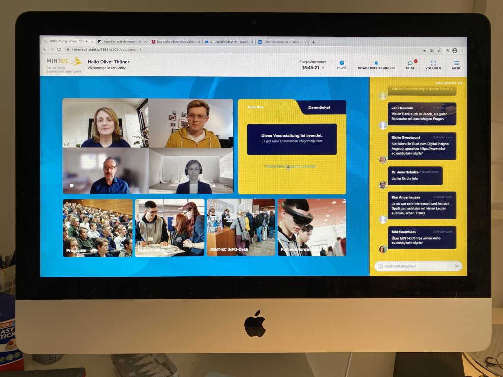 Auch der MINT EC musste seine beliebte "Mint 400" Veranstaltung in der Hauptstadt dieses Jahr pandemiebedingt absagen. Ersetzt wurde sie durch das "Mint EC Digitalforum 2021" unter dem Titel: "V.U.C.A. - Meine digitale Zukunft und ich". V.U.C.A. steht dabei für Volatility - Uncertainty - Complexity - Ambiguity. Auf Deutsch bedeutet das in etwa: Unbeständig - Unsicher - Kompliziert - Mehrdeutig. Das klingt bedrohlich, beschreibt aber doch die Sorgen, die mit der Digitalisierung einhergehen. Dies ist aber kein Grund Angst zu haben und den Kopf in den Sand zustecken. Diese Mint EC Veranstaltung wollte die Chancen und Möglichkeiten der Digitalisierung nicht nur diskutieren, sondern zeigte eben an konkreten Beispielen in Fachvorträgen, Diskussionen und vor allem Workshops für Lehrende und Lernende, welche Möglichkeiten schon ganz einfache Tools (neudeutsch für "digitale Werkzeuge") für kollaboratives, effektives und zeitgemäßes Arbeiten bieten. Man konnte sich nicht nur austauschen, sondern man konnte auch ausprobieren. Und letzteres nimmt einem vielleicht ein wenig die Angst vor Unsicherheit und komplizierter Mehrdeutigkeit. Zu oft ist die Rede von der maroden Infrastruktur, die ja für digitales Arbeiten die Grundvoraussetzung ist. Staatssekretärin Dorothee Bär hat aus dem Kanzleramt in ihrem Grußwort fest versprochen, dass da noch sehr viel investiert wird (wir werden sie beim Wort nehmen, angesichts der vielen Probleme!). Und gerade war es sehr angenehm, dass man sich über das "wie" und das "was" der Digitalisierung austauschen konnte.