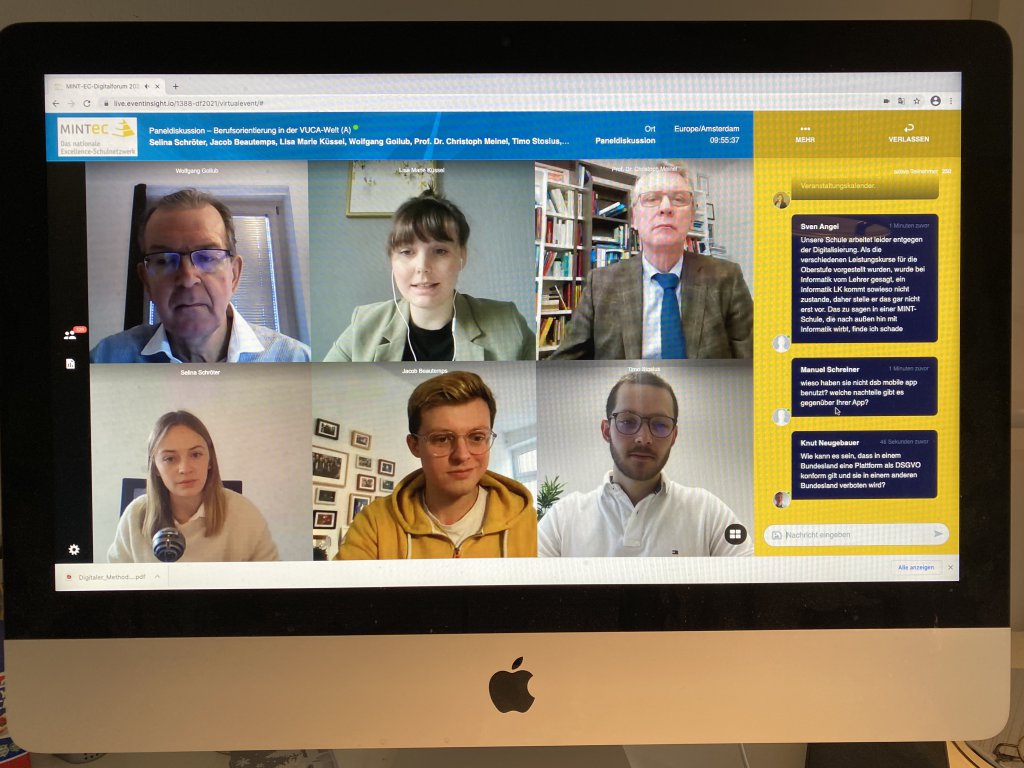 Nachdem nach und nach alle Teilnehmer auf der Plattform eintrafen, gab es zu Beginn eine kurze Begrüßung von Herrn Gollub, dem Vorstandsvorsitzenden von MINT-EC und unter der Moderation des Youtubers Jacob Beautemps, der über gesamten Tag die Moderation souverän leitete.