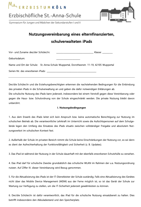 Schulgeräte NutzungsbedingungenHier finden Sie die Leih- und Nutzungsvereinbarung für ein iPad, das Sie von der Schule erhalten haben. Download |