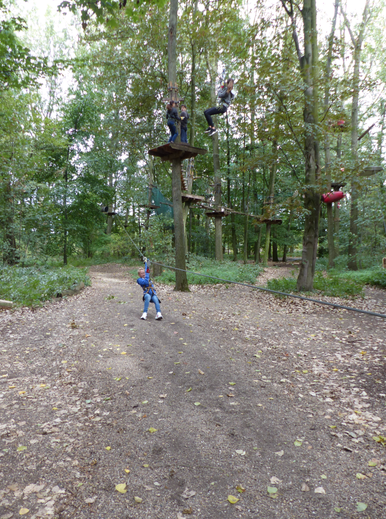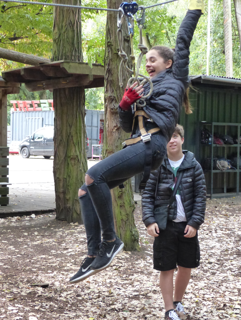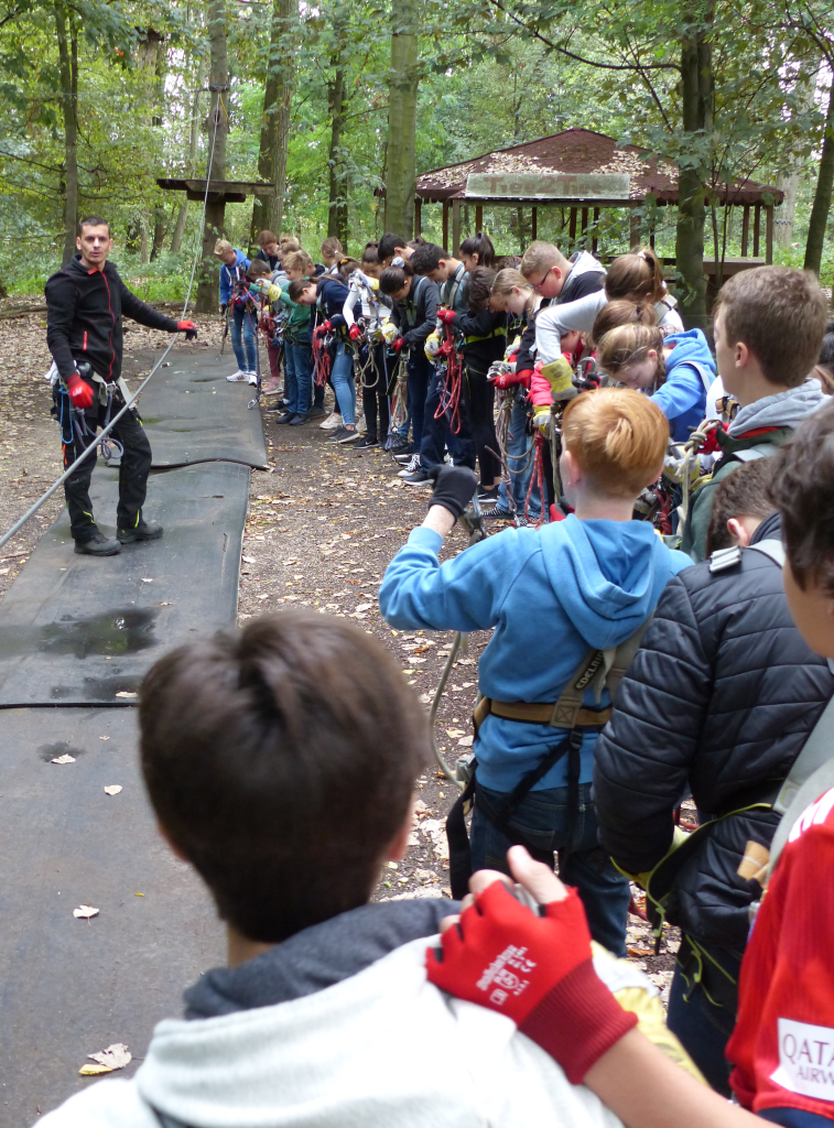 Der erste Blick in den Kletterwald ist noch ein skeptischer und nicht alle Erklärungen zur Handhabung von Handschuhen, Karabinerhaken und Seilen werden auf Anhieb von allen verstanden, weshalb es einiger Übersetzungen ins Portugiesische durch den Kollegen Ivan Millarch bedarf. Dann aber verläuft der Kletter-Spaß reibungslos. 27 kletternde deutsche und brasilianische Schülerinnen und Schüler und sogar die beiden Lehrerinnen Frau Ewald aus Rio und Frau Butenkemper trauen sich in die luftigen Höhen des Kletterwaldes am Rhein-Herne-Kanal (siehe Fotos).